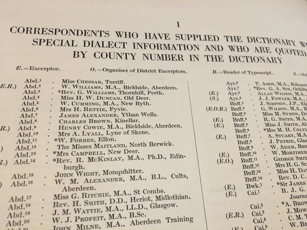 Some years ago, I mentioned to a parent at my daughter’s school that I was a lexicographer. Oh, she said, her great-uncle from Orkney had contributed some words to ‘the Scottish Dictionary’; she wished she knew more. The next day, I was able to show her his name in the list of Contributors and tell her how to search for ‘his words’ in the DSL. This is no longer possible, and it is hard to fathom why. The list is already in digital form, and online dictionaries do not face the space constraints of their forebears. The reason must therefore be that the current publishers of the DSL – Scottish Language Dictionaries in partnership with the University of Glasgow – regard it as unimportant. Perhaps they think that only dictionary historians will bother about these details; or that anyone who cares to try can find the list in a print copy. But it is becoming increasingly hard to access the printed SND. Many public libraries have dispensed with their bulky copies, believing that the online version supersedes them. Soon, the identity of the Misses Maitland will only be available to those who can access a copy in one of the legal deposit libraries.